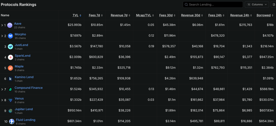 The market exhibits a classic “one dominant player with multiple strong challengers” structure. Aave leads decisively with approximately $32.9 billion in TVL, far exceeding competitors such as Compound (with about $2.6 billion), while capturing over 50% of lending TVL. Nevertheless, its moat is not brand or network effects—largely irrelevant in open-source ecosystems—but continuous product iteration and ecosystem expansion. From Aave V1’s floating-rate model, to V2’s credit delegation and flash loans, to V3’s Portal cross-chain liquidity and isolation mode, each Aave generation precisely addresses prevailing market pain points. The upcoming V4 release—scheduled for mid-2026—will further enhance cross-chain liquidation capabilities and embed institutional-grade compliance frameworks. Against Aave’s dominance, a cohort of differentiated protocols is carving out their own niches. Morpho Labs pursued an unconventional evolutionary path: beginning as an optimization layer atop Aave and Compound (boosting capital efficiency via P2P matching), it gradually evolved into independent offerings such as Morpho Blue (oracle-free, governance-free lending) and Morpho Vaults (professional risk managers curating yield strategies), transitioning from “optimization layer” to “standalone protocol”. Spark Finance, meanwhile, leverages MakerDAO’s DSR (DAI Savings Rate) ecosystem to establish a robust user base in stablecoin lending, with its technical synergy with Aave V3 positioning it as a key conduit for institutional adoption.