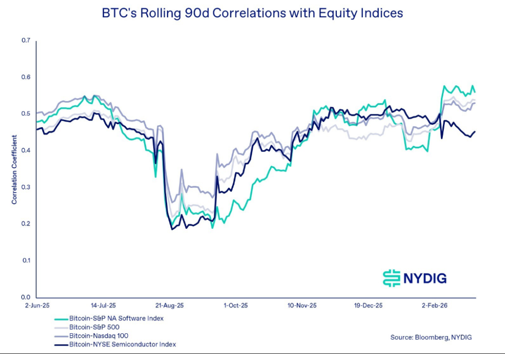 Greg Cipolaro, jefe de investigación de NYDIG, presentó el argumento en una nota del viernes. Su argumento: cuando Bitcoin y las acciones de software se mueven en la misma dirección, no es porque estén estructuralmente vinculados. Ambos están reaccionando a las mismas presiones macroeconómicas — del tipo que empujan a los inversores hacia o lejos de los activos de riesgo en general.