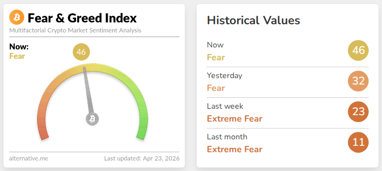 Esta acumulación está ocurriendo en un contexto de mejora, aunque aún cautelosa, del sentimiento del mercado. El Índice de Miedo y Codicia de Crypto de Alternative.me se disparó 14 puntos en un solo día hasta alcanzar una puntuación de 46 sobre 100 — la lectura más alta desde el 18 de enero y el mayor salto de un día en más de tres meses.