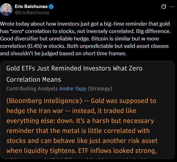 Añadió que ambos son reservas de valor, señalando que uno es sólido mientras que el otro es un poco más joven. En una publicación separada en X, Balchunas calificó al oro como ‘de correlación cero con las acciones’ y una gran diversificación, pero una ‘cobertura poco confiable’.