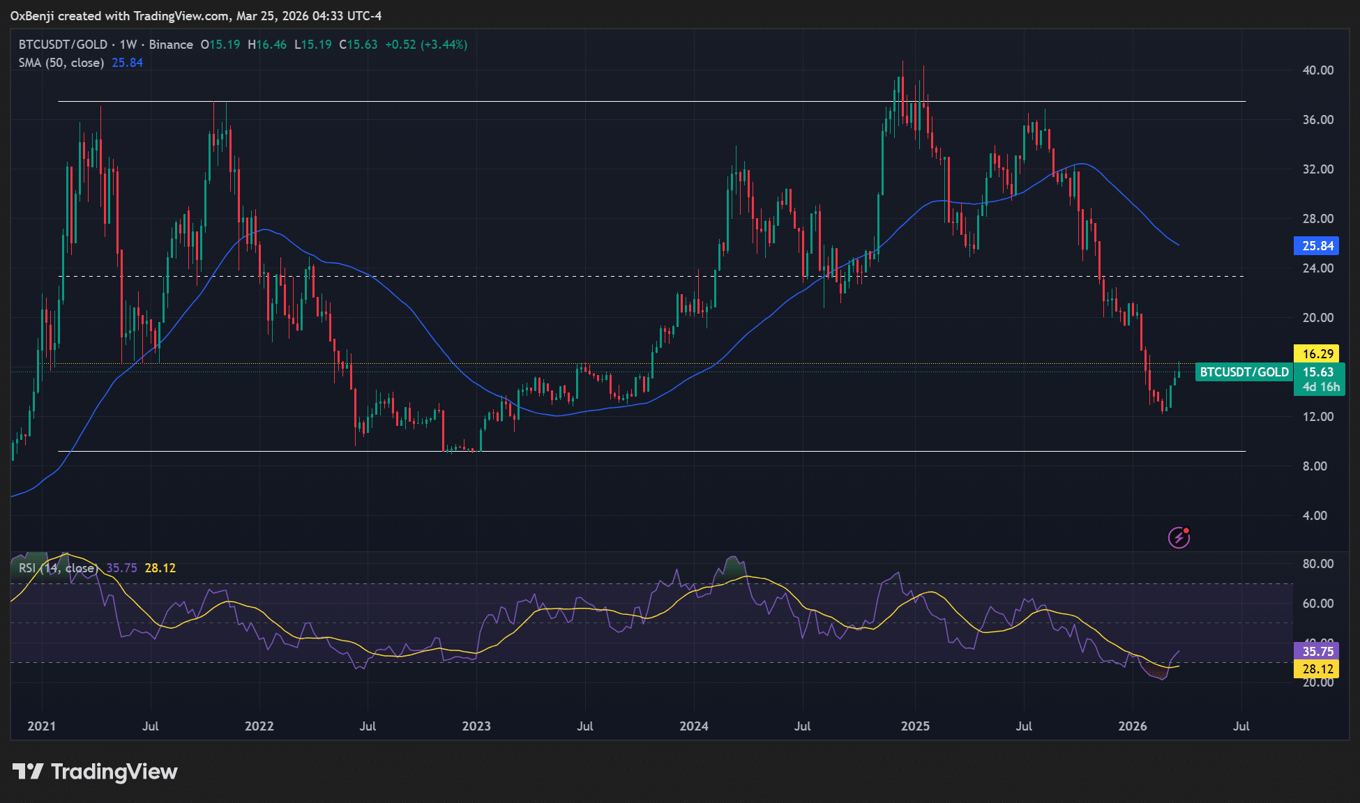 Dicho esto, la relación BTC/Oro, que sigue el rendimiento relativo de BTC frente al oro, todavía se encontraba en un rango plurianual.