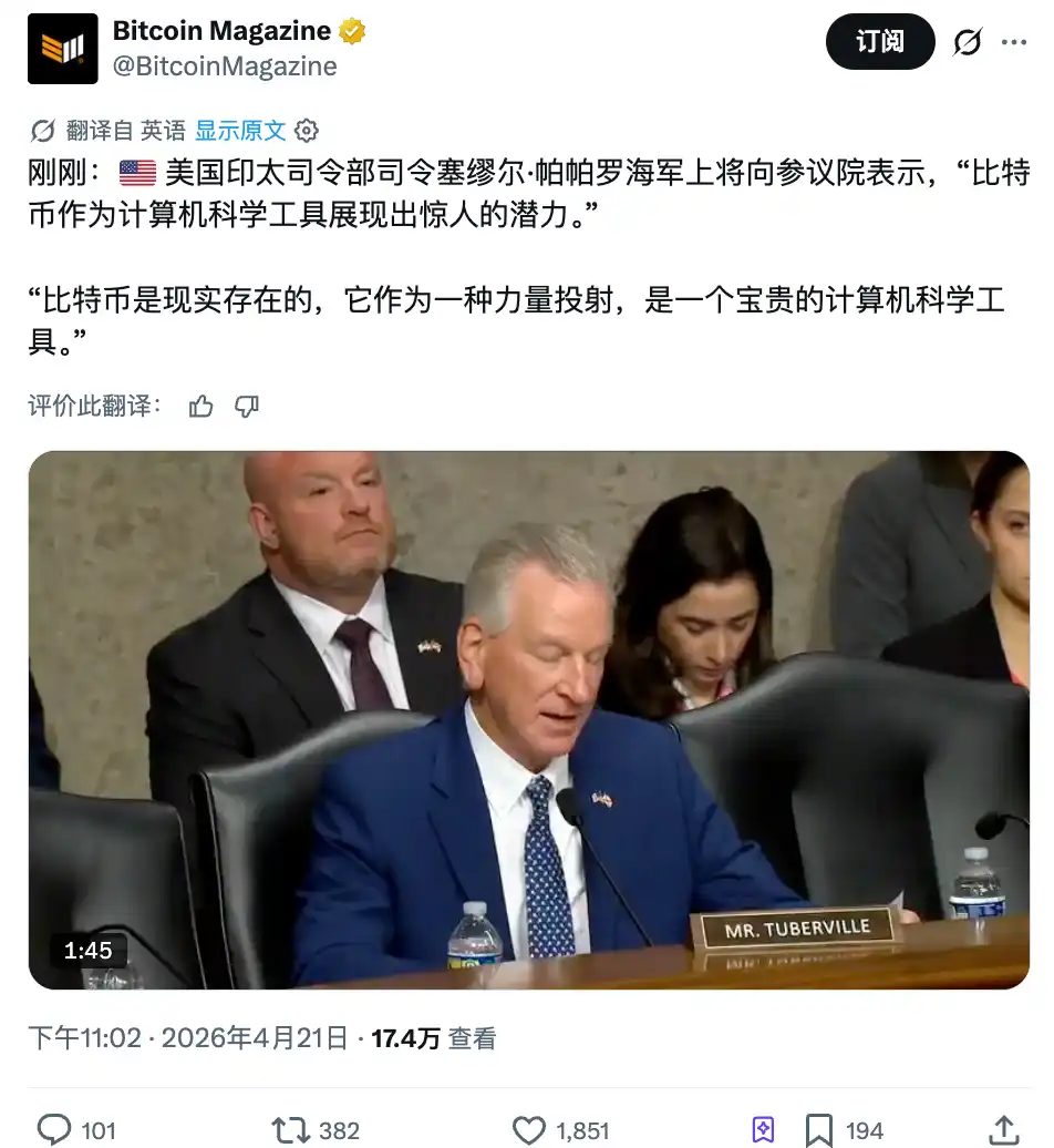 El 21 de abril, Paparo, en la audiencia de revisión de la autorización de defensa del año fiscal 2027 ante el Comité de Servicios Armados del Senado, respondió a una pregunta del senador Tommy Tuberville (republicano, Alabama) sobre el valor estratégico de Bitcoin.