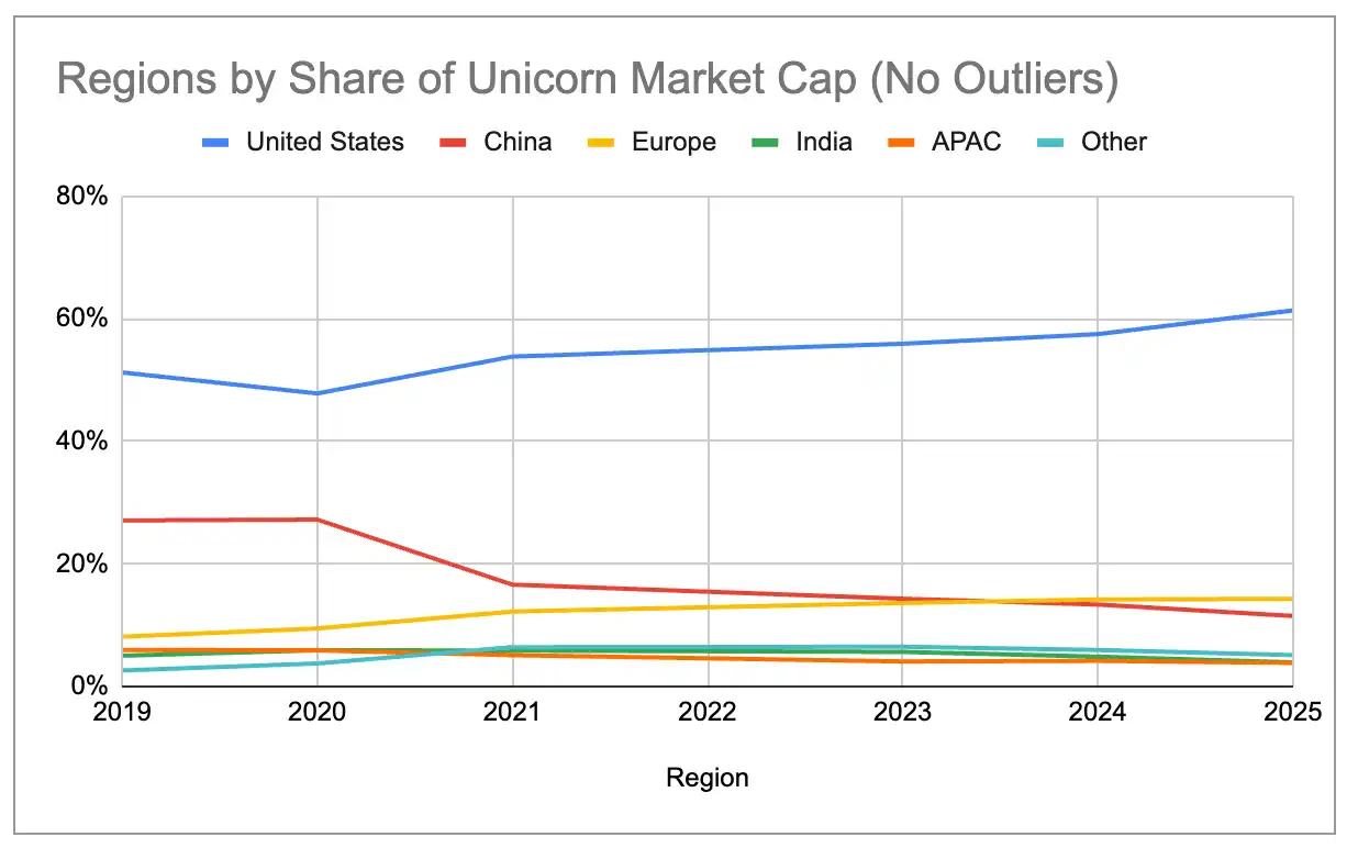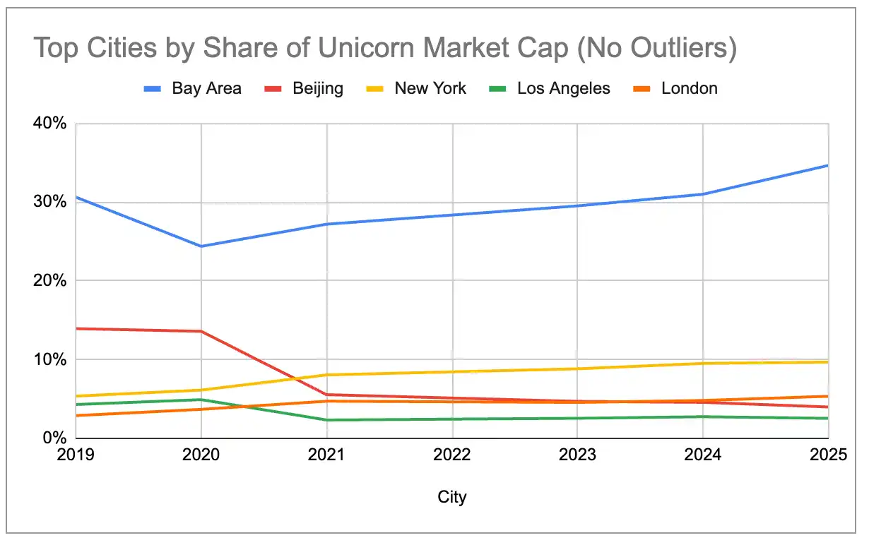 Incluso eliminando los tres valores atípicos más grandes: OpenAI ($500B), SpaceX ($400B) y ByteDance ($300B), los grandes ecosistemas han seguido concentrándose desde 2019. La participación de EE.UU. ha aumentado constantemente, mientras que la de China ha disminuido constantemente. Europa superó a China en el valor de mercado total de unicornios en 2024, y Nueva York y Londres también superaron a Beijing.