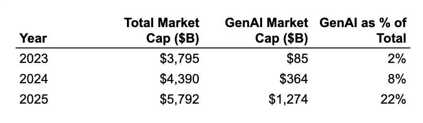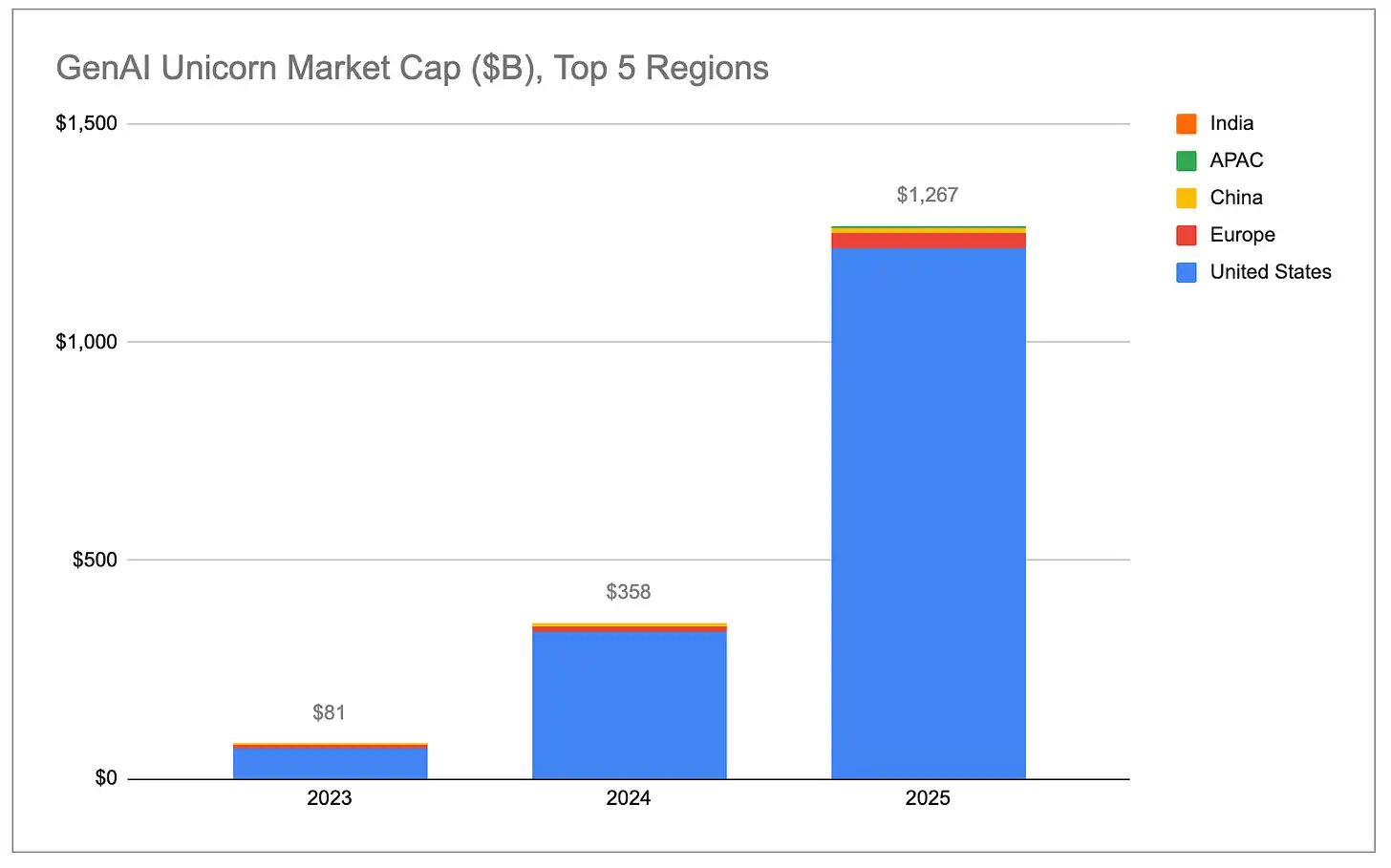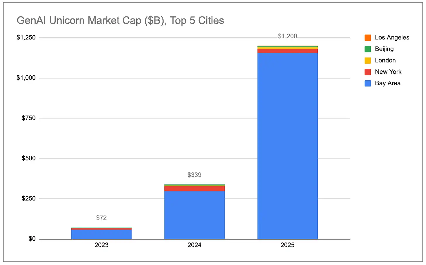 El valor de mercado total de los unicornios de IA generativa ha crecido exponencialmente, y casi todo el incremento proviene de EE.UU., especialmente del Área de la Bahía.