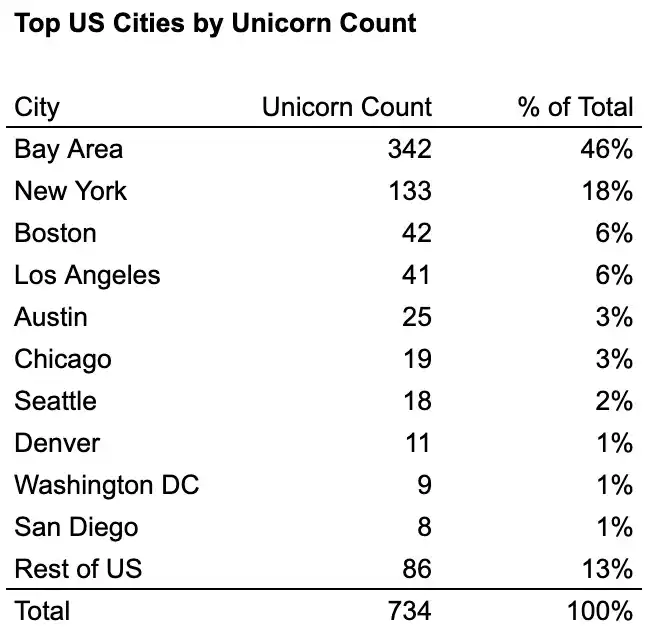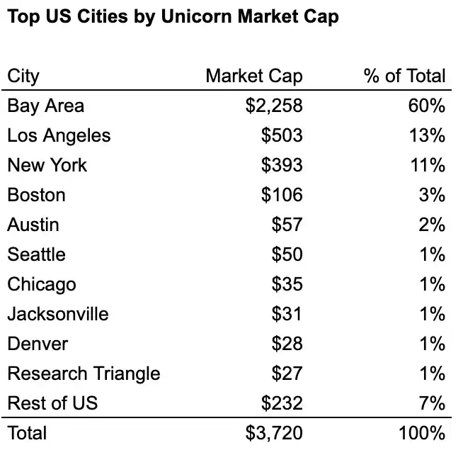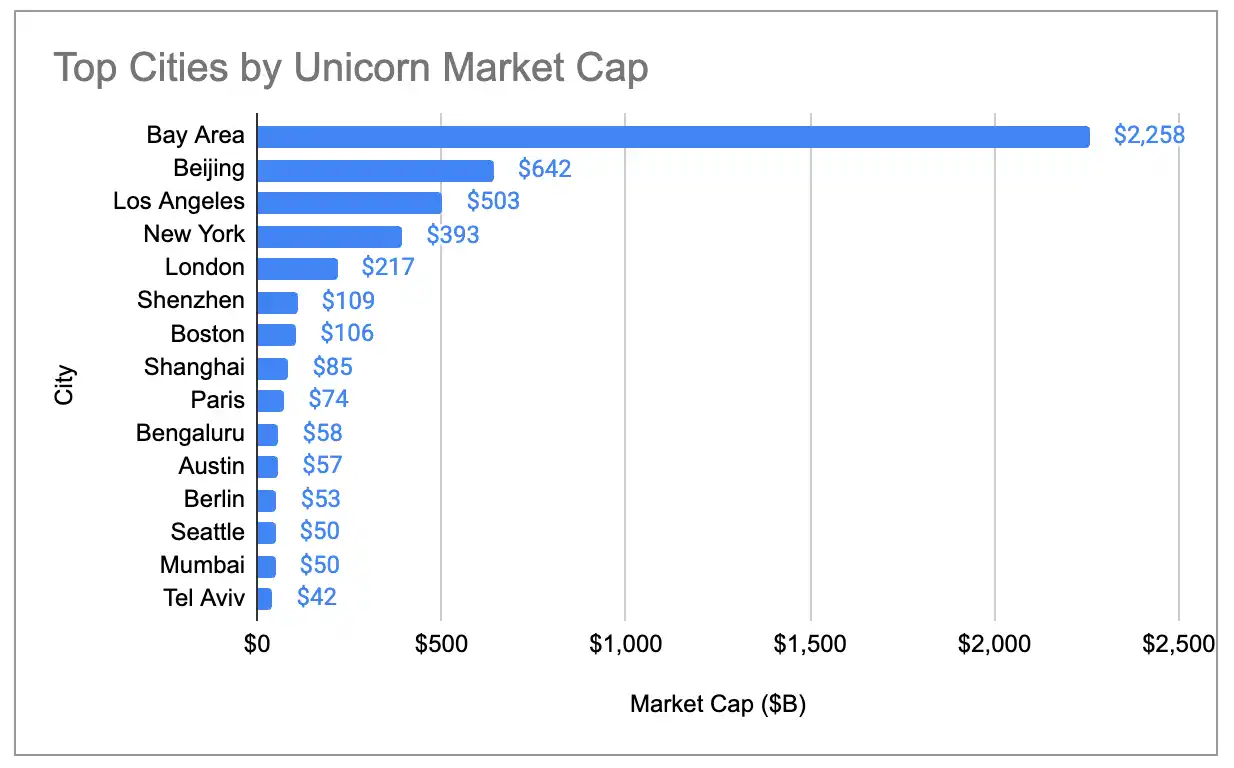 Dentro de EE.UU., cuatro "ciudades industriales" representan aproximadamente el 76% del número de unicornios y alrededor del 87% de su valor de mercado: el Área de la Bahía, Nueva York, Los Ángeles y Boston. Entre ellas, el Área de la Bahía es el líder absoluto, con más del doble de unicornios que el segundo lugar y más de 4 veces el valor de mercado del segundo.