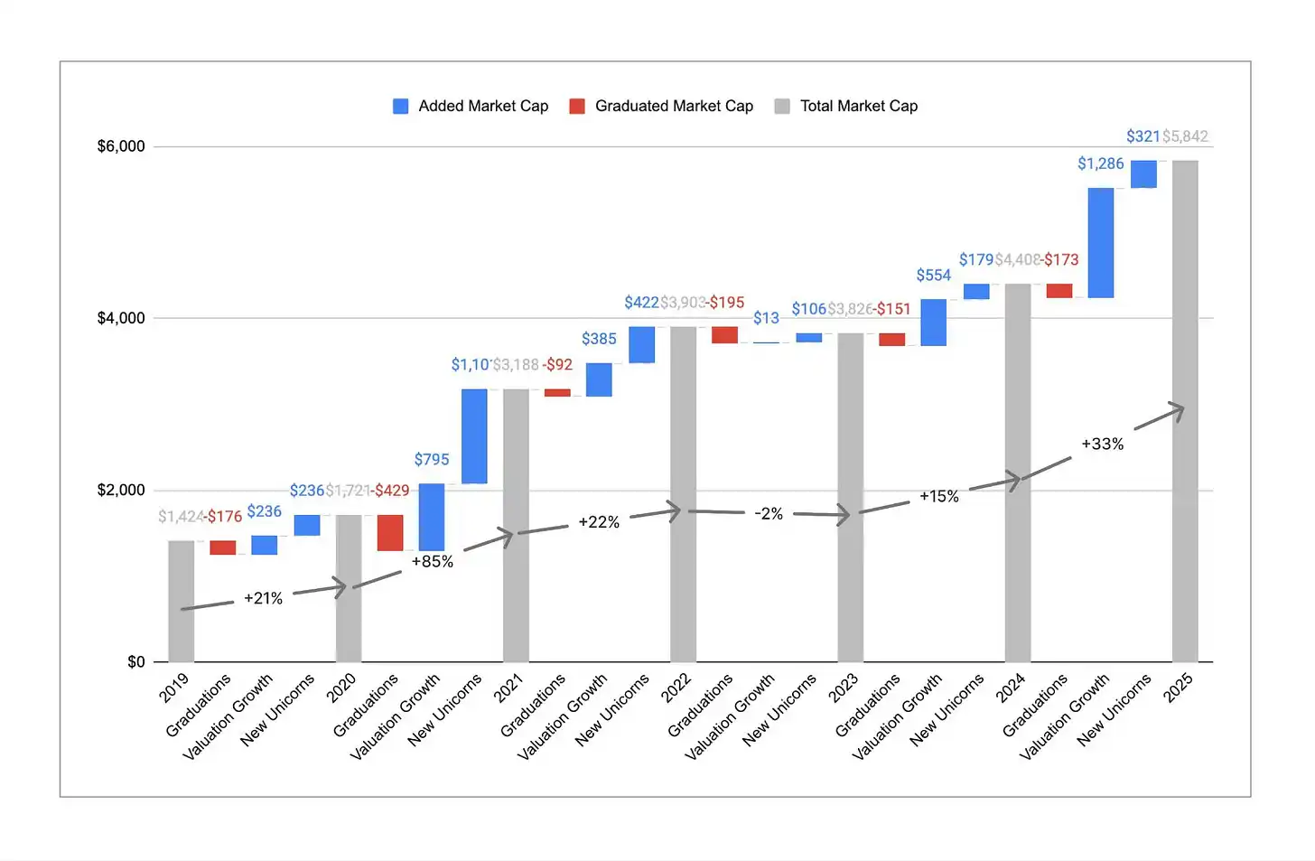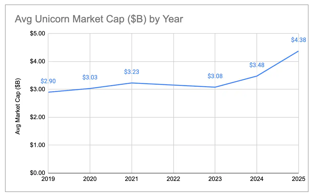 Aunque el número de unicornios se mantuvo prácticamente plano, el valor de mercado total creció significativamente. En el último año, el valor de mercado global de los unicornios pasó de aproximadamente $4.4 billones a alrededor de $5.8 billones, un aumento del 33%. Esto representa una fuerte recuperación, especialmente en comparación con 2023, cuando el valor de mercado total en realidad se contrajo interanual. Históricamente, el crecimiento del valor de mercado fue impulsado más por nuevas empresas que se convertían en unicornios, pero en 2025 alrededor del 80% del crecimiento provino del aumento de la valoración de los unicornios existentes. El resultado es que el valor de mercado promedio por unicornio aumentó de aproximadamente $3B a alrededor de $4.4B, el valor más alto en los seis años que llevamos realizando este análisis. Es más difícil convertirse en unicornio, pero una vez que se supera el umbral de los $1B, estas empresas valen más, en promedio, y crecen más rápido.