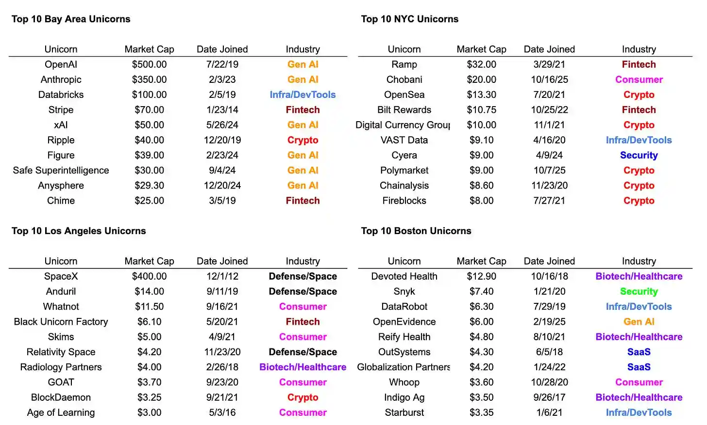 - Los centros de unicornios se agrupan en torno a industrias específicas. 6 de los 10 principales unicornios del Área de la Bahía son empresas de IA; 7 de los 10 principales de Nueva York son empresas de fintech/cripto; 3 de los 5 principales de Los Ángeles son empresas de defensa/espacio (SpaceX, Anduril, Relativity, representando el 83% del valor de mercado total de LA), y entre los 10 principales también hay 4 empresas de consumo.