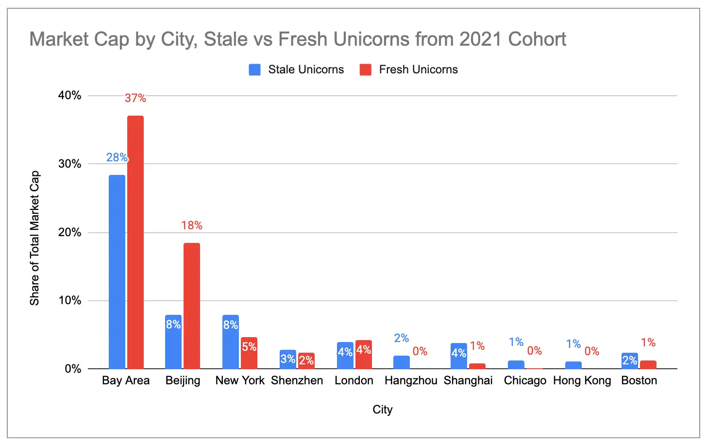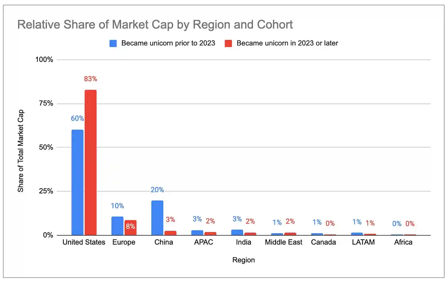 - La nueva generación de unicornios está más concentrada en EE.UU. y el Área de la Bahía. Entre los unicornios nacidos en 2023 y posteriores, EE.UU. representa el 83% del valor de mercado total, mientras que entre los nacidos en 2022 y antes, la cifra era solo del 60%. La participación del Área de la Bahía es aún más exagerada: 63% para la nueva generación frente al 33% para la generación anterior.