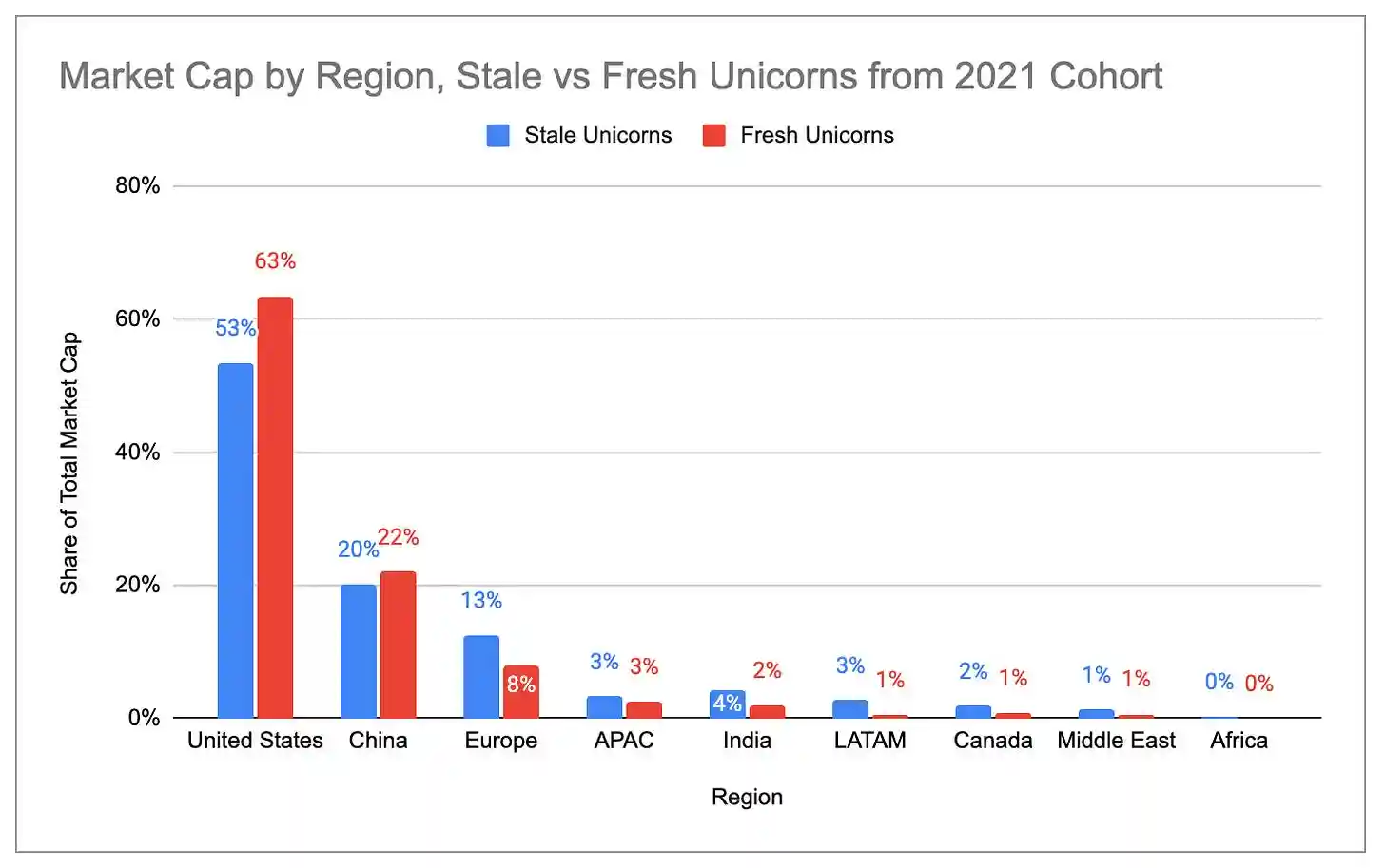 La concentración geográfica del valor de mercado global de los unicornios alcanzó un máximo histórico. Estados Unidos representa el 65% del valor de mercado total de todos los unicornios, por encima del 58% del año pasado y del 44% de 2020. La participación de EE.UU. es aproximadamente 4 veces mayor que la de China, que ocupa el segundo lugar.