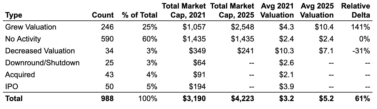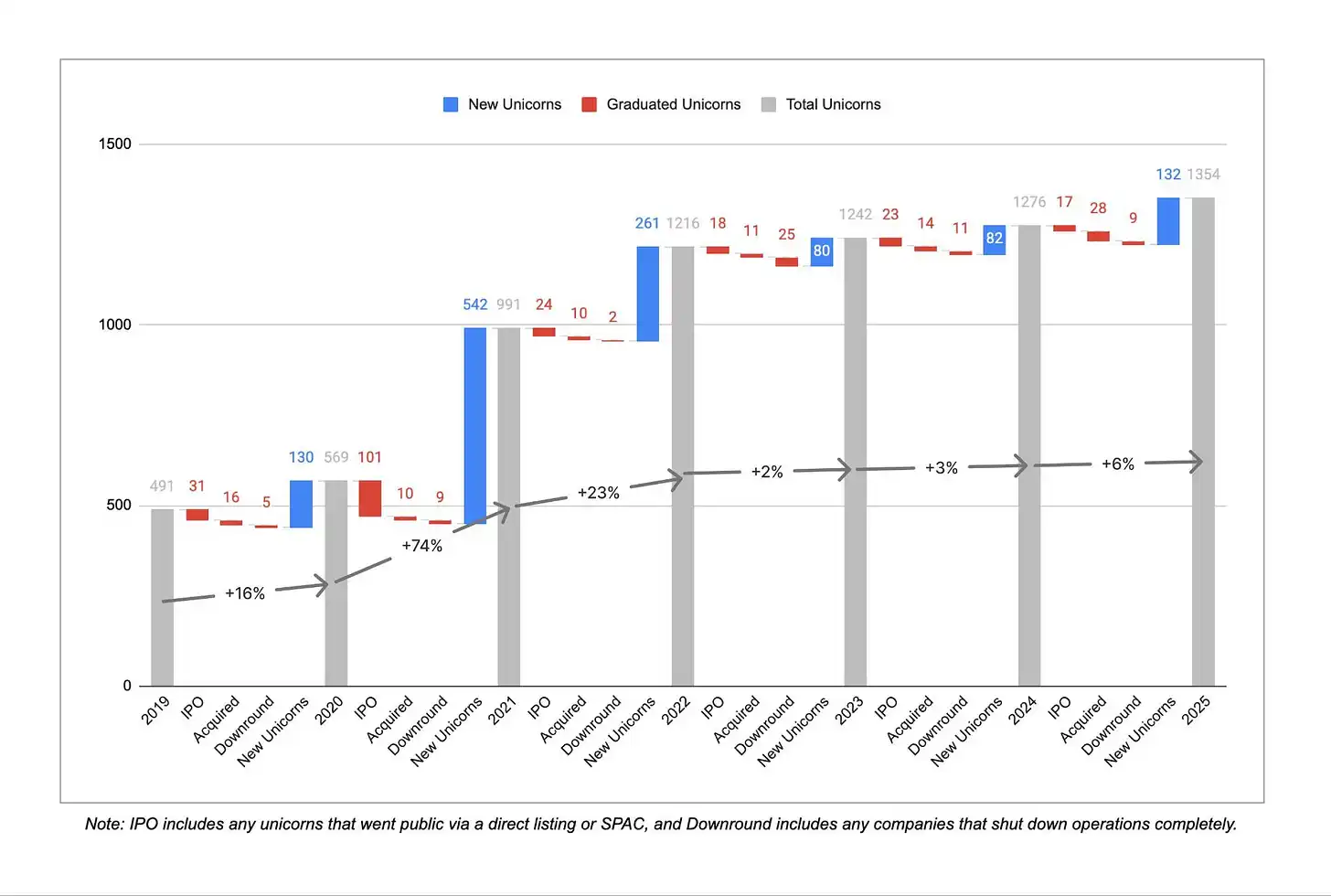 Después de tres años consecutivos de alto crecimiento, el ritmo de nacimiento de nuevos unicornios se ha desacelerado notablemente en los últimos tres años. Entre diciembre de 2019 y diciembre de 2022, un promedio de más de 300 empresas alcanzaron por primera vez el estatus de unicornio cada año. De diciembre de 2022 a diciembre de 2025, esta cifra se redujo a alrededor de 100 por año, aunque 2025 mostró una recuperación en comparación con los dos años anteriores. Simultáneamente, en los últimos tres años, 45 empresas perdieron su estatus de unicornio debido a recortes de valoración o cierres, en comparación con solo 16 en el trienio anterior, lo que indica que la corrección de las valoraciones infladas de la era de las tasas de interés cero de 2021/2022 aún continúa.