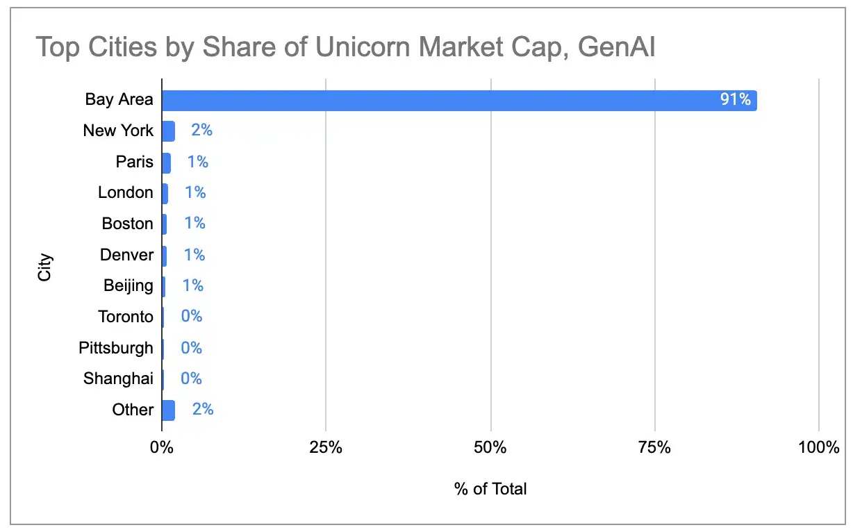 En términos de participación relativa, las empresas de IA generativa pasaron del 2% del valor de mercado global de los unicornios en 2023 al 22%. Si esta tendencia continúa, el Área de la Bahía, con su cuasi monopolio de las principales empresas y talento de IA, verá su participación en el valor de mercado global de los unicornios ampliarse.