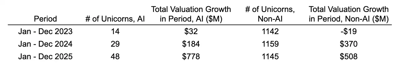 El crecimiento de la valoración de los unicornios de IA supera con creces al de los unicornios no relacionados con IA. Las 48 empresas de IA que se convirtieron en unicornios durante 2025 aumentaron su valor de mercado total en $778 mil millones durante ese año. Esta cifra supera la suma del aumento de valor de mercado de los más de 1100 unicornios no relacionados con IA restantes. Incluso excluyendo a OpenAI (aumentó ~$343B) y Anthropic (aumentó ~$334B), el crecimiento promedio interanual de la valoración de los unicornios de IA generativa fue de aproximadamente $2.2B, 5 veces el crecimiento promedio de los unicornios no relacionados con IA (~$440M).