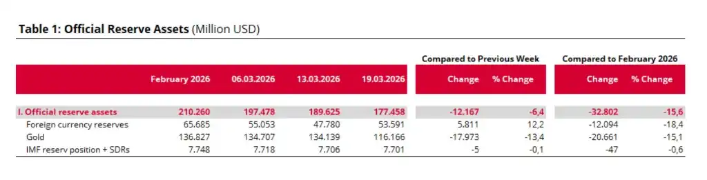 Los datos semanales de Turquía registran completamente este proceso: las reservas de divisas (excluyendo el oro) cayeron desde 55.000 millones de dólares el 6 de marzo hasta 47.800 millones el 13 de marzo —primero se usaron las reservas en divisas. Para el 19 de marzo, las reservas de divisas se recuperaron a 53.600 millones de dólares, pero las reservas de oro cayeron simultáneamente de 134.100 millones a 116.200 millones de dólares— las reservas en divisas casi se agotaron, y se comenzó a utilizar el oro.