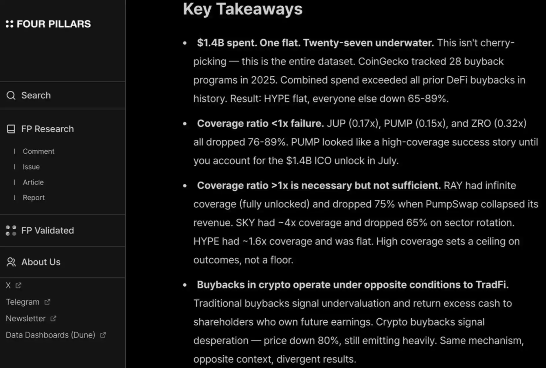 Me gusta mucho este informe de fourpillars, que muestra que recompras de hasta diez cifras casi no ayudan a establecer un suelo de precio a largo plazo para los proyectos.