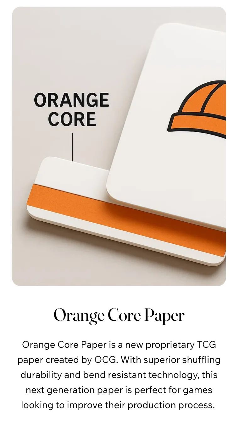 Para que su juego de cartas se destaque, la empresa evitó el cartón estándar de la industria (blue core) y en su lugar desarrolló su propio material de "núcleo naranja" (orange core). Este cartón patentado reduce problemas comunes como el desgaste de los bordes y el curvado de las cartas. Orange Cap Games controla la selección de materiales y el proceso de fabricación, extendiendo la propiedad del producto hasta los detalles de producción.