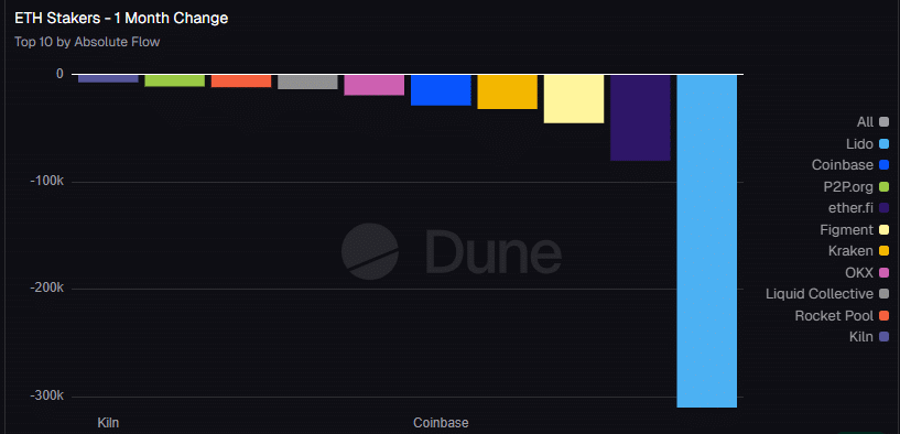 En contraste, las salidas de Lido no han disminuido ni siquiera en 2026. Solo en marzo, Lido lideró las salidas de staking, con casi 310K ETH saliendo del protocolo.