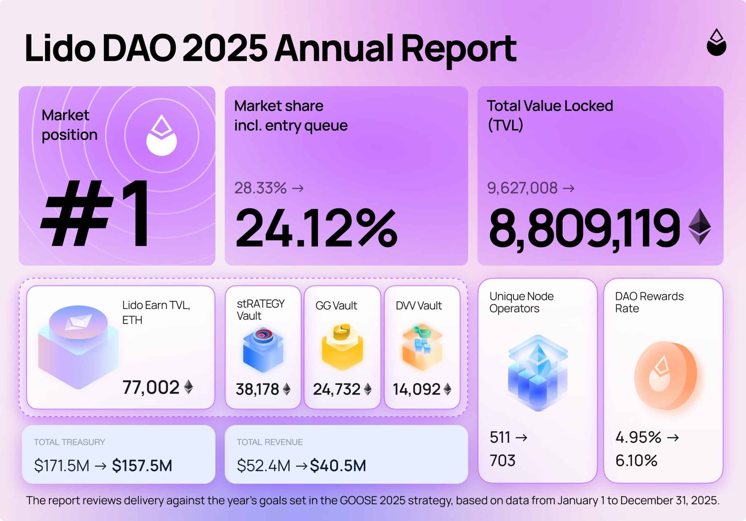 Aun así, Lido mantuvo su cuota de mercado dominante en un 24% (8.8 millones de ETH en staking). Sin embargo, se centrará en la diversificación en 2026.