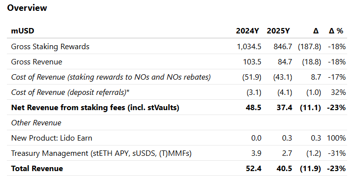 En su informe anual de 2025, la Fundación Lido declaró que los ingresos totales del protocolo fueron de $40.5 millones, frente a los $52.4 millones alcanzados en 2024—una disminución del 23% en los ingresos en base interanual.