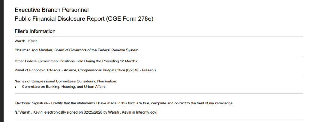 En ese contexto, Kevin Warsh, la elección del presidente estadounidense Donald Trump para reemplazar al presidente de la Reserva Federal, Jerome Powell, presentó la semana pasada una declaración financiera que reveló inversiones personales en empresas de criptomonedas e inteligencia artificial.