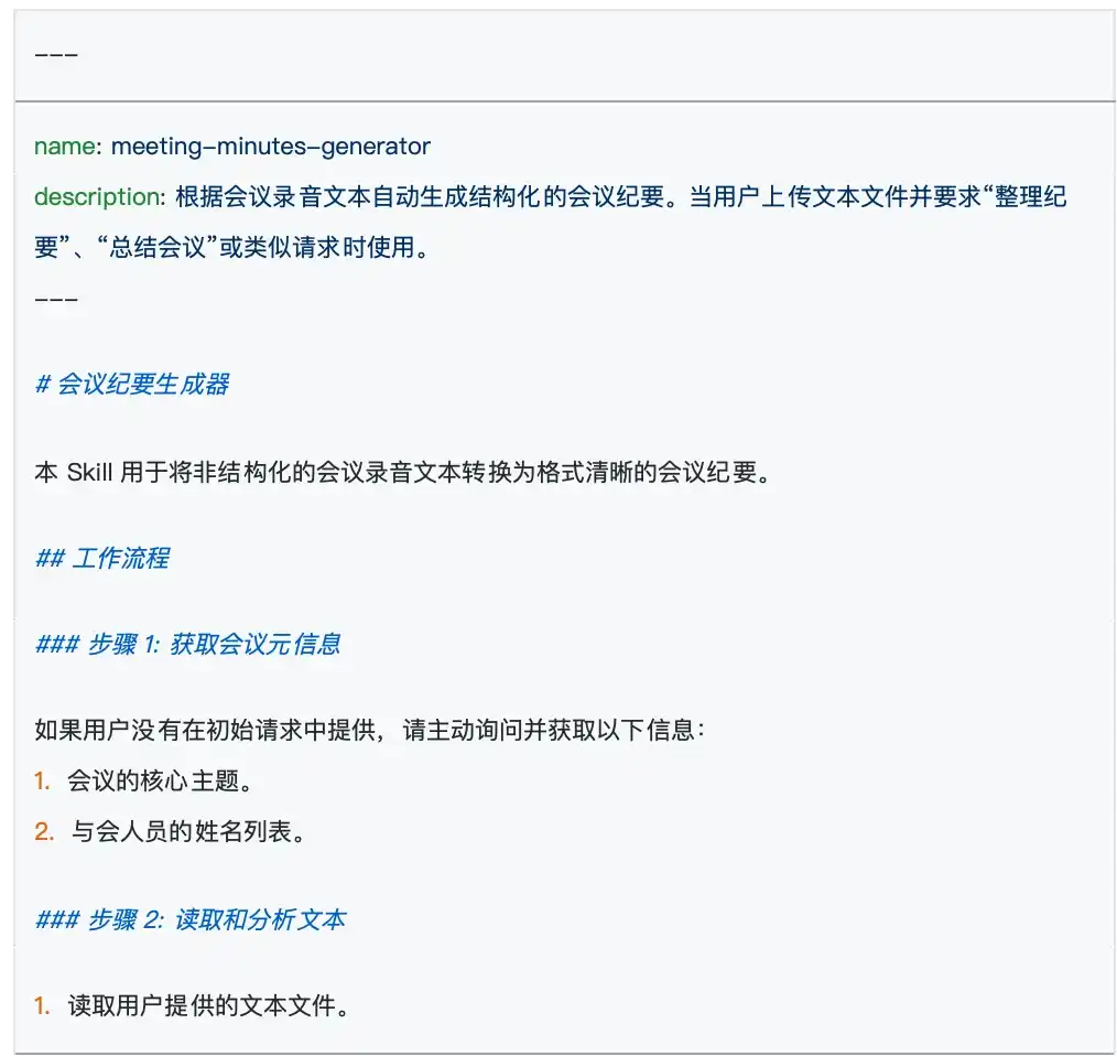 Paso 4: Ejecución estricta y respuesta de salida Finalmente, la herramienta cliente envía tanto "la solicitud original del usuario" como "el contenido completo de skill.md del Asistente de resumen de reuniones" al modelo de lenguaje grande. Esta vez, el modelo de lenguaje grande ya no está tomando decisiones, sino que entra en modo de ejecución. Sigue estrictamente las reglas establecidas en skill.md (por ejemplo: debe extraer participantes, temas centrales, decisiones finales), genera una respuesta altamente estructurada y la presenta al usuario a través de la herramienta cliente.
