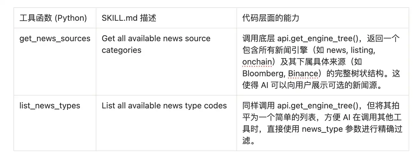 Insight clave: Cuando el Agent de IA invoca estas herramientas, no sabe que el servidor MCP ejecutó internamente una operación de dos pasos de "obtener-filtrar nuevamente". Para la IA, simplemente invoca una herramienta mágica que puede devolver directamente "noticias de alta puntuación" o "noticias favorables", simplificando enormemente el flujo de trabajo de la IA.