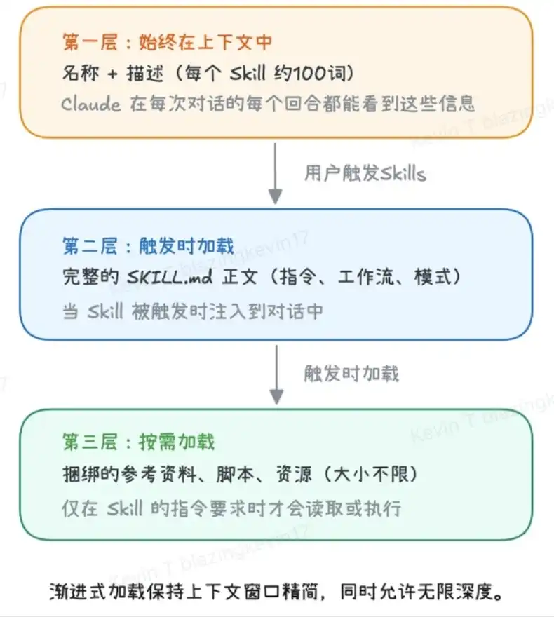 Si仔细回味 todo el proceso de carga, descubrirás que la filosofía de diseño de Agent Skill es en realidad un mecanismo extremadamente preciso de divulgación progresiva. Para ahorrar al máximo la potencia de cálculo y mantener la eficiencia, su sistema está estrictamente dividido en tres capas, y las condiciones de activación de cada capa se ajustan paso a paso: