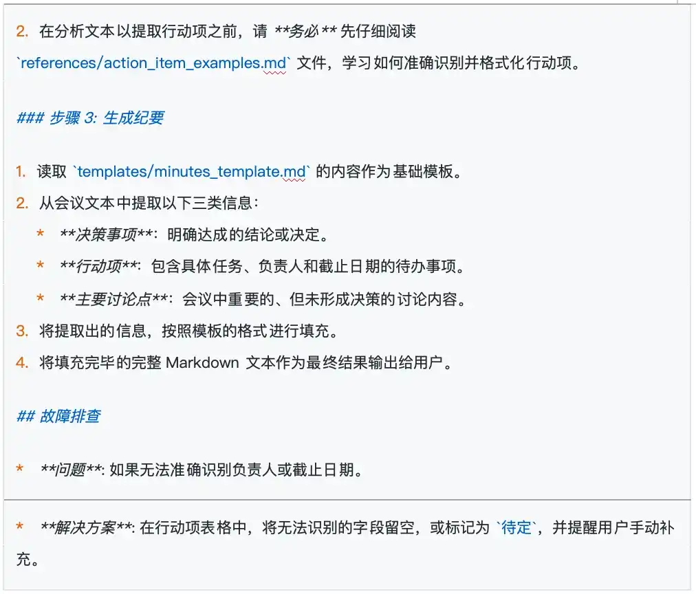 A medida que el negocio se profundiza, a menudo queremos que el Skill se vuelva más inteligente. Tomando el "Asistente de resumen de reuniones" como ejemplo, esperamos que no solo pueda repetir los temas, sino que también proporcione valor de insight incremental: cuando la reunión decida gastar dinero, pueda marcar directamente en el resumen si cumple con la合规 financiera del grupo; cuando se involucre cooperación externa, pueda alertar automáticamente sobre riesgos legales potenciales. De esta manera, al ver el resumen, el equipo puede detectar de un vistazo las alertas clave de合规, evitando la tediosa consulta secundaria de regulaciones.