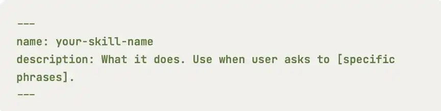 Cada Agent Skill debe tener un archivo skill.md. Su función es decirle a la IA: quién soy, qué puedo hacer y cómo debes trabajar según mis requisitos. Al abrir este archivo, encontrarás que está claramente dividido en dos partes: