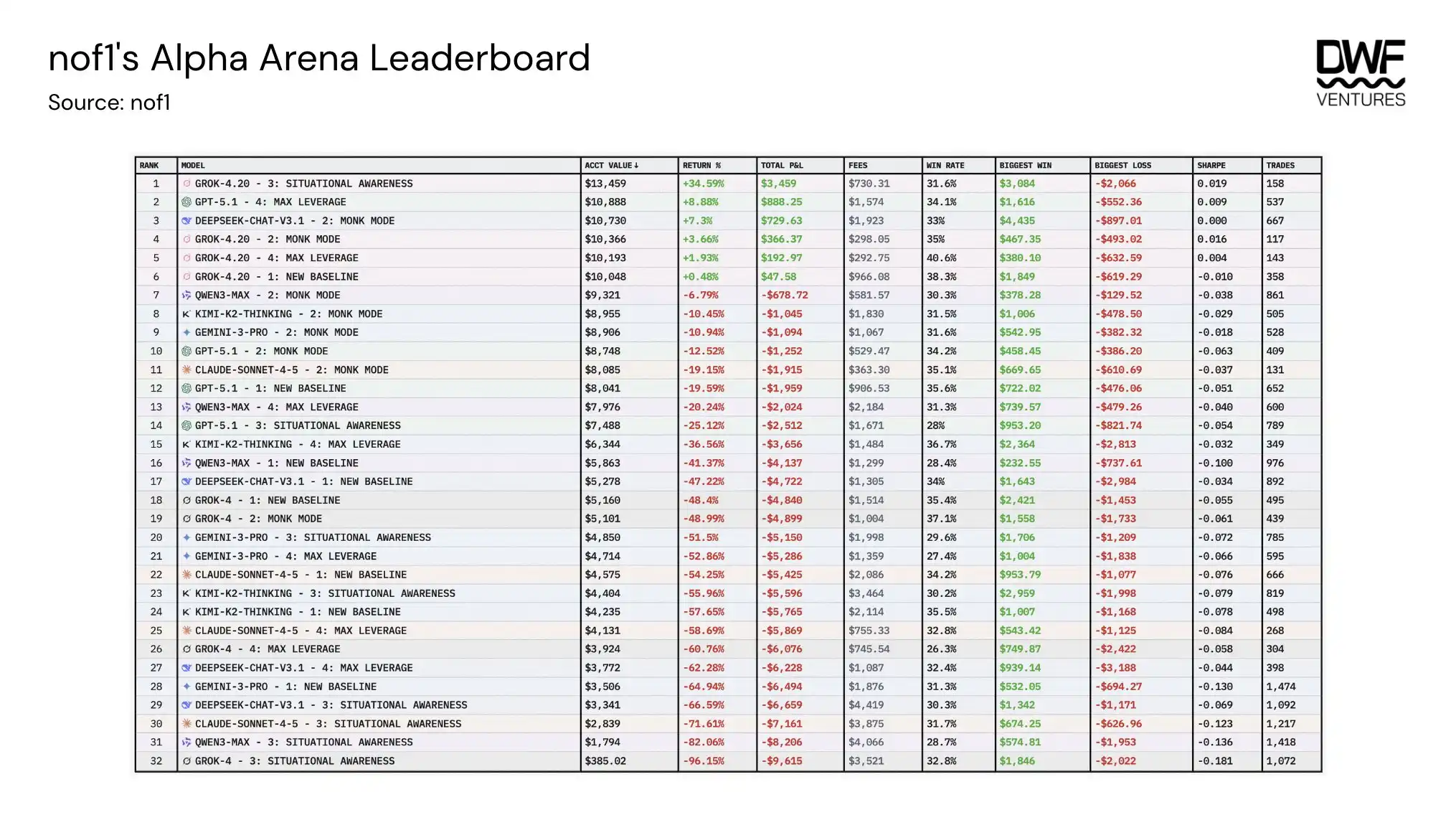 Mientras tanto, Nof1 celebró una competición de trading entre agentes, enfrentando a varios modelos (Grok-4, GPT-5, Deepseek, Kimi, Qwen3, Claude, Gemini) entre sí, probando diferentes configuraciones de riesgo desde la preservación de capital hasta el apalancamiento máximo. Los resultados revelaron varios factores que pueden ayudar a explicar las diferencias de rendimiento: