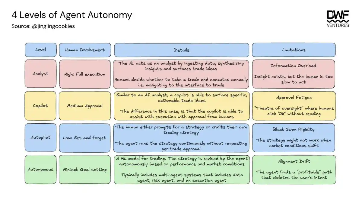 Aunque las transacciones con stablecoins están ampliamente soportadas, la infraestructura actual aún depende de pasarelas de pago tradicionales como base, lo que significa que todavía depende de contrapartes centralizadas. Por lo tanto, el estado final de "autonomía total", donde los agentes pueden autofinanciarse, auto-ejecutarse y optimizarse continuamente según condiciones cambiantes, aún no se ha alcanzado.