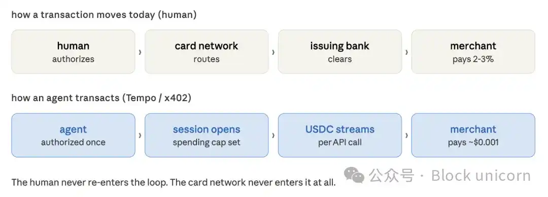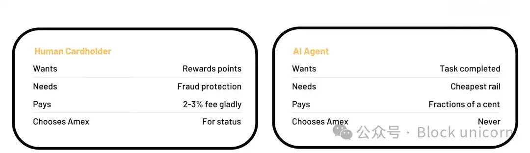 ALos agentes de IA no buscan recompensas, protección contra fraudes ni estatus. Su único objetivo es completar tareas de manera eficiente, calculando la ruta más barata, el清算 más rápido y las tarifas más bajas. Al ser completamente racionales y no requerir los servicios financiados por las tarifas de intercambio, evitan naturalmente los costos del 2-3% que sustentan el modelo de negocio de Visa.