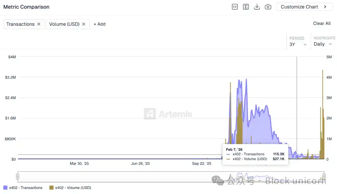A pesar de que el ecosistema alrededor de x402 tiene una valoración de aproximadamente 7 mil millones de dólares, los datos on-chain muestran que el protocolo tuvo un volumen de transacciones diario de solo alrededor de 28,000 dólares la semana pasada, la mayoría de las pruebas en lugar de transacciones reales. Ese número es astronómicamente pequeño en comparación con el volumen diario de Visa.
