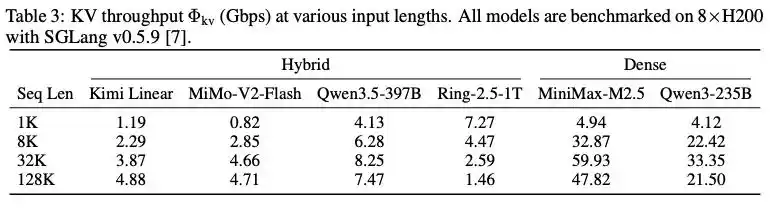 Para demostrar la ventaja de la arquitectura de modelo híbrido, el artículo menciona un conjunto de experimentos: bajo el framework de inferencia SGLang v0.5.9 y 8 tarjetas H200, se realizaron pruebas de referencia en varios modelos principales. Con una longitud de contexto de 32K, el rendimiento KV del modelo MiMo-V2-Flash que utiliza atención híbrida fue de solo 4.66 Gbps, mientras que el modelo de atención densa de escala similar MiniMax-M2.5 alcanzó 59.93 Gbps, demostrando directamente que la arquitectura de atención híbrida puede reducir los requisitos de transmisión de caché KV a un rango que puede ser soportado por Ethernet común.