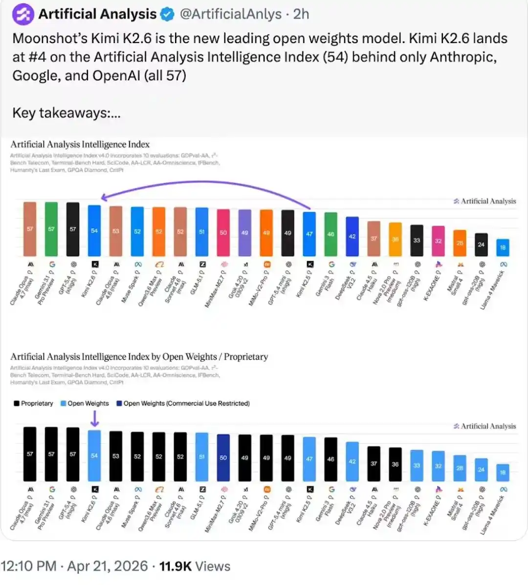 Lista de inteligente Artifacial Analysis, Kimi K2.6 solo es superado por tres modelos cerrados y lidera la lista de pesos de modelos de código abierto