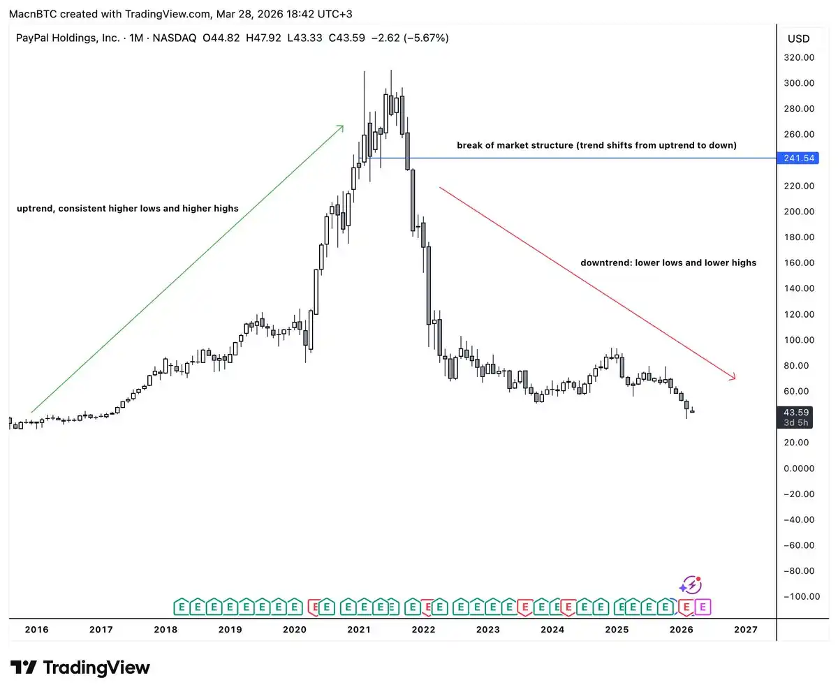 El gráfico mensual de PYPL es un ejemplo perfecto de la estructura del mercado. A la izquierda, se ve una clara tendencia alcista. El gráfico estaba formando mínimos más altos y máximos más altos, y el precio subía continuamente.
