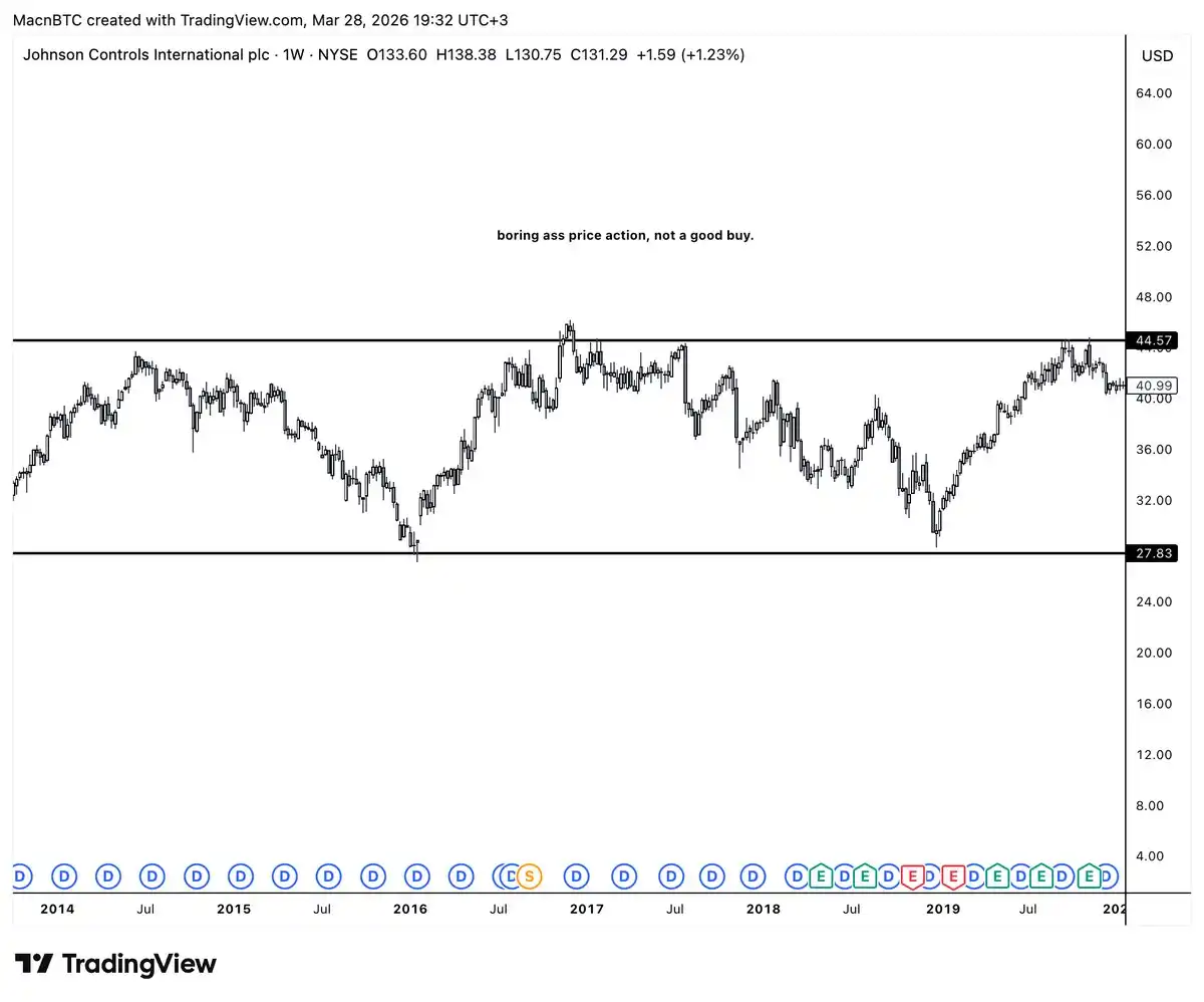Aquí tienes un gráfico que no ha hecho nada en más de cinco años. La misma fluctuación lateral, sin ninguna ruptura en la estructura del mercado, solo un aburrido movimiento lateral. No compres un gráfico que se vea así, es mejor que lleves tu dinero a Las Vegas y lo apuestes todo al caballo negro.