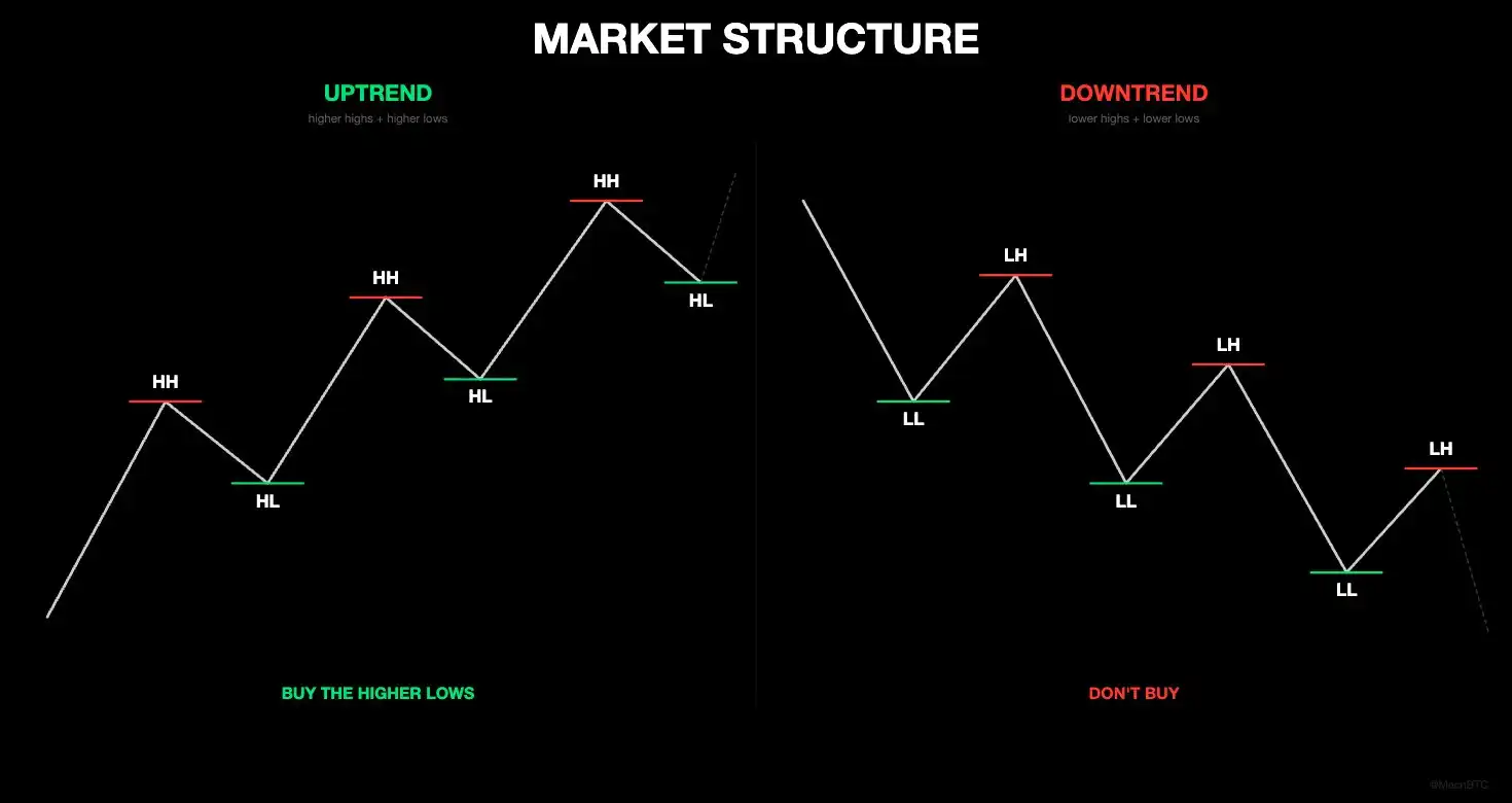 En 2023, el precio de Bitcoin fluctuaba entre 15.000 y 20.000 dólares, haciendo máximos más bajos, mínimos más bajos, y casi todo el mundo decía que "las criptomonedas están muertas". Luego, el precio superó el "máximo más bajo" anterior en torno a los 25.000 dólares (flecha verde en el gráfico). Esta ruptura lo cambió todo. A partir de entonces, continuó formando máximos más altos y mínimos más altos, disparándose hasta los 125.000 dólares. Fíjate que incluso si entras "tarde", aún puedes ganar dinero. No necesitas comprar en el fondo de 15.000 dólares, solo necesitas ver la inversión de estructura alrededor de 25.000 a 30.000 dólares y luego comprar. Incluso si llegas unas semanas o meses tarde, aún puedes obtener ganancias.