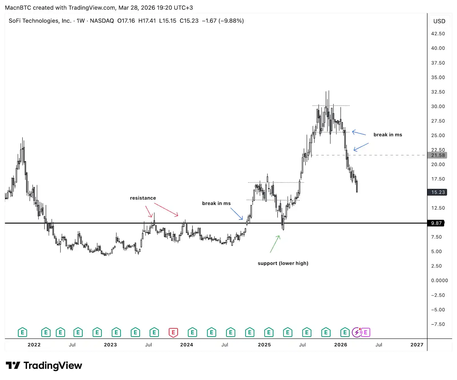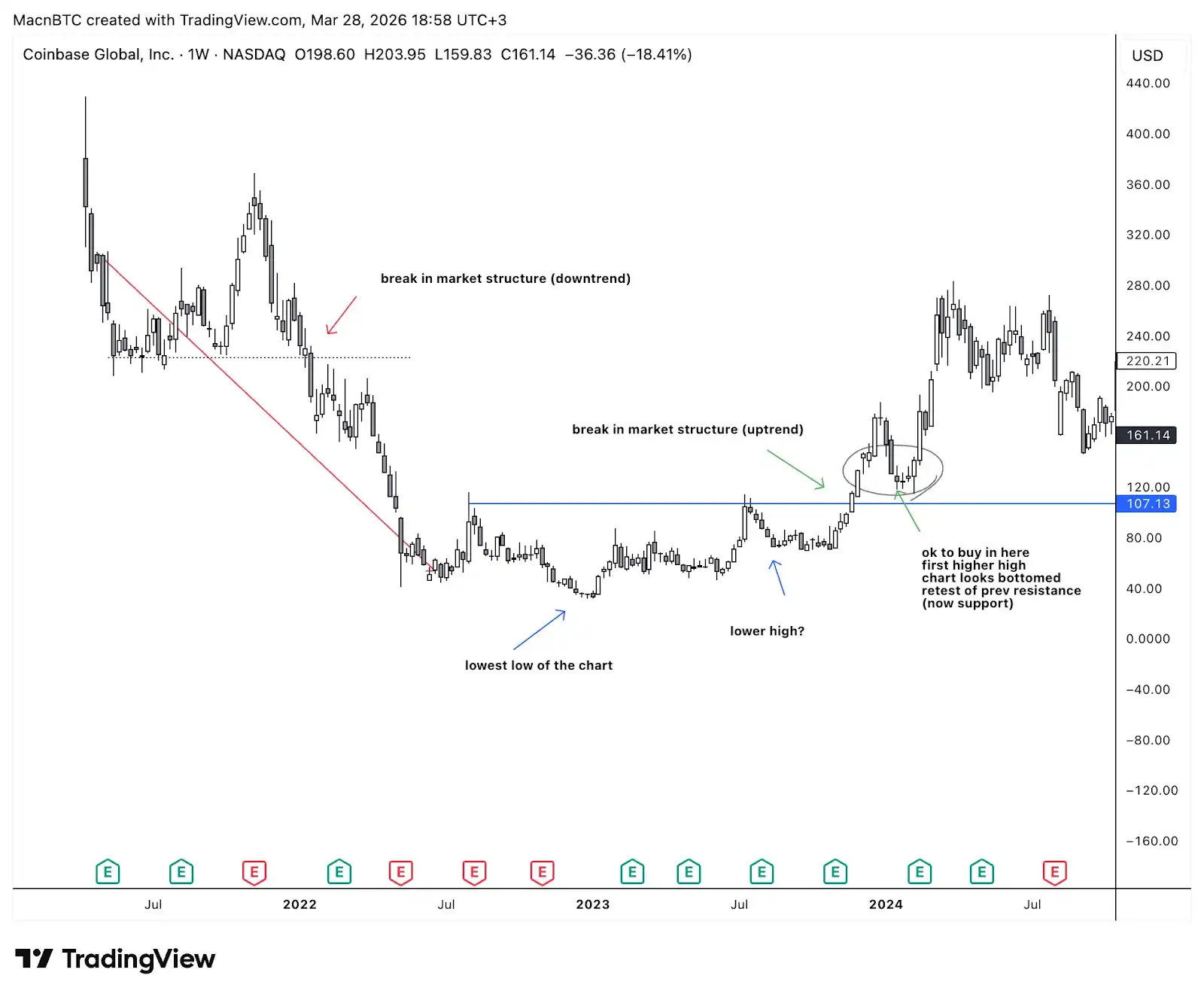 Echemos un vistazo al gráfico semanal de Coinbase.