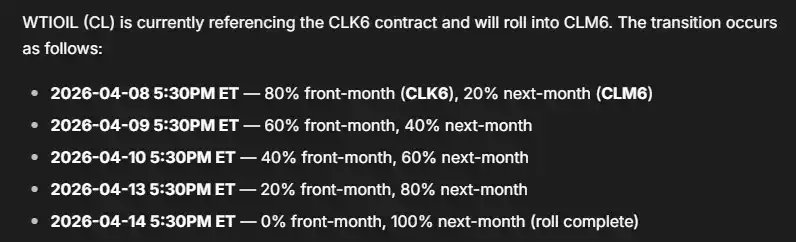 Los futuros de crudo son una serie de contratos organizados por mes de entrega. Mayo, junio, julio, cada uno con su propio precio. Cuando el contrato del mes próximo a vencer está cerca de expirar, el mercado debe cambiar del contrato antiguo al nuevo, una acción conocida como rollover.