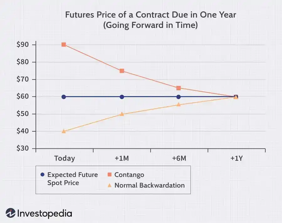 En condiciones normales, los contratos de meses posteriores implican que los productores de petróleo almacenarán el crudo durante algunos meses más, generando costos adicionales de almacenamiento, por lo que el precio de entrega debería ser más alto. El mercado llama a este fenómeno, donde los contratos futuros son más caros que los del mes cercano, "contango" (prima a plazo). Por el contrario, cuando el contrato del mes cercano es más caro que el del mes lejano, se llama "backwardation" (estrangulamiento). Esto suele ocurrir cuando hay escasez inmediata y hay una mayor demanda de recibir el petróleo ahora.