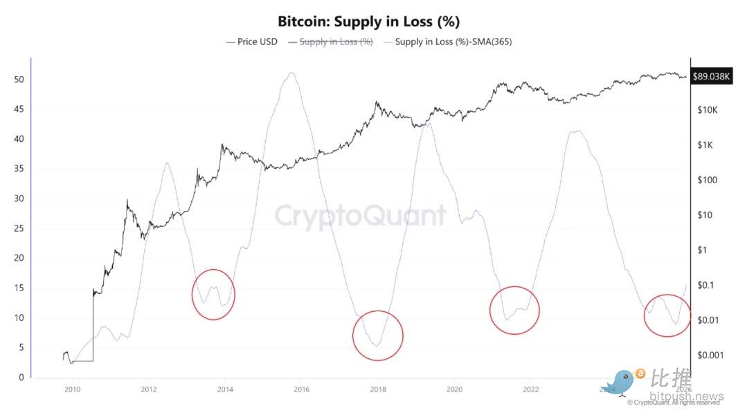 El último análisis de CryptoQuant muestra que la media móvil de 365 días del "porcentaje de oferta de Bitcoin en pérdidas" (Supply in Loss) está subiendo de nuevo. Este indicador se utiliza para medir el porcentaje de Bitcoin cuyo precio actual es inferior al precio de su última transferencia on-chain, y es una herramienta importante para observar cambios en la estructura del mercado.