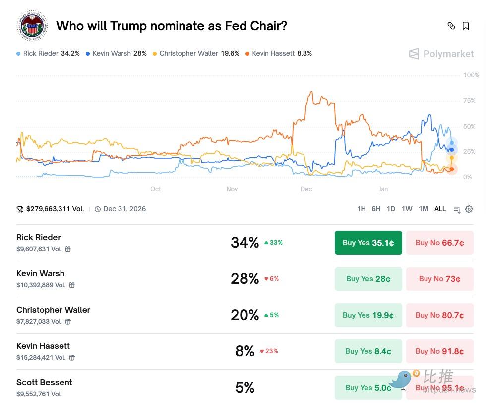 En la visión del mercado, si Rieder asume la presidencia de la Fed, significaría que las decisiones del banco central prestarán más atención a las condiciones financieras y las señales de precios de los activos, manteniendo la flexibilidad política dentro del rango permitido por la inflación. Esta expectativa explica por qué está obteniendo cada vez más apoyo financiero en el mercado de predicciones: es una apuesta por la "predictibilidad" y la "amabilidad del mercado".