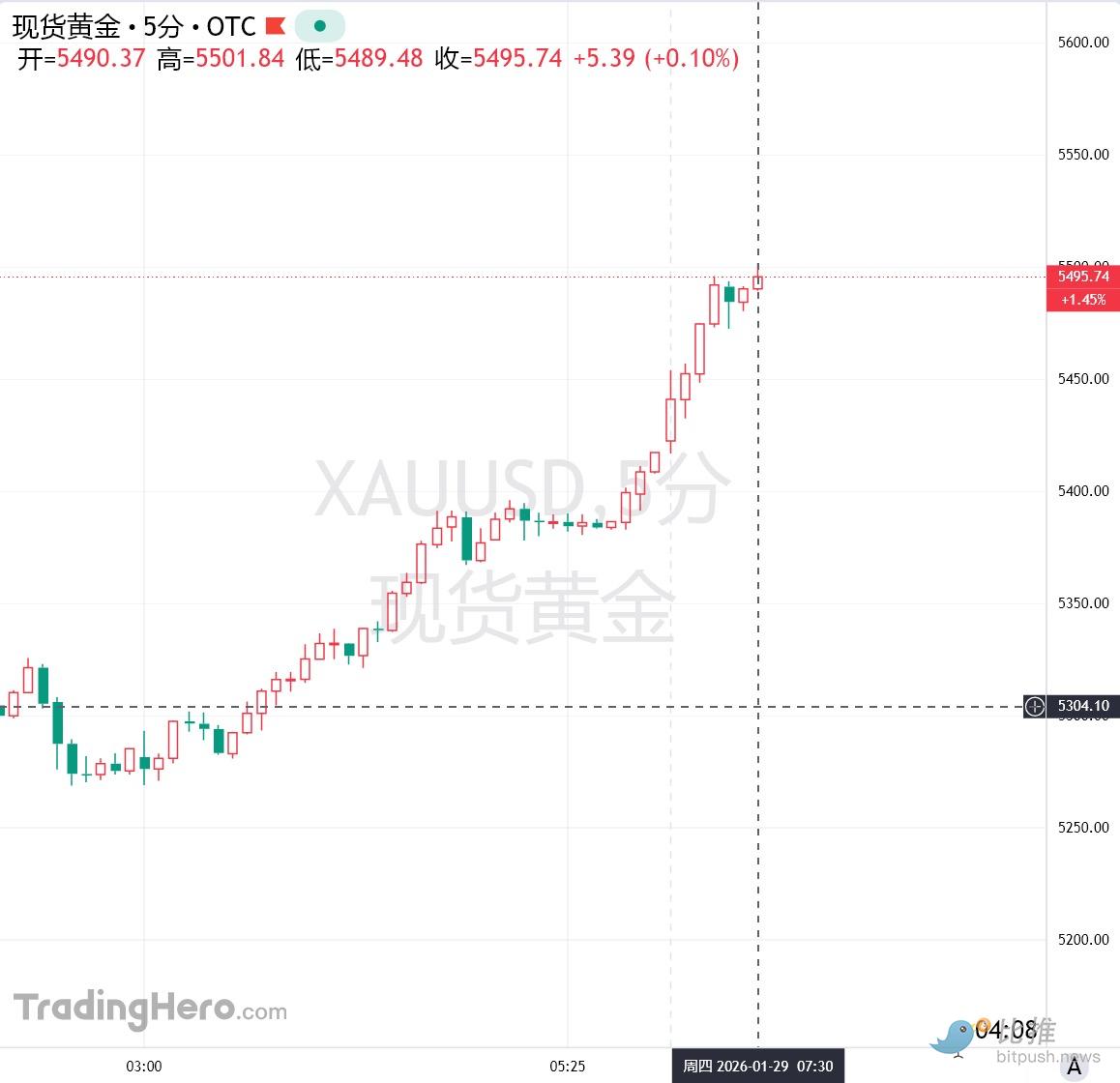 Después del anuncio de la tasa de interés, el precio del oro spot se disparó, superando por primera vez la barrera de los 5500 dólares por onza. En apenas cuatro días de negociación, el precio del oro subió desde poco menos de 5000 dólares, rompiendo múltiples barreras de cien en cien, con una subida acumulada de más de 500 dólares y una ganancia semanal del 10%. Esta velocidad y magnitud convierte al oro en el protagonista indiscutible del mercado global actual.