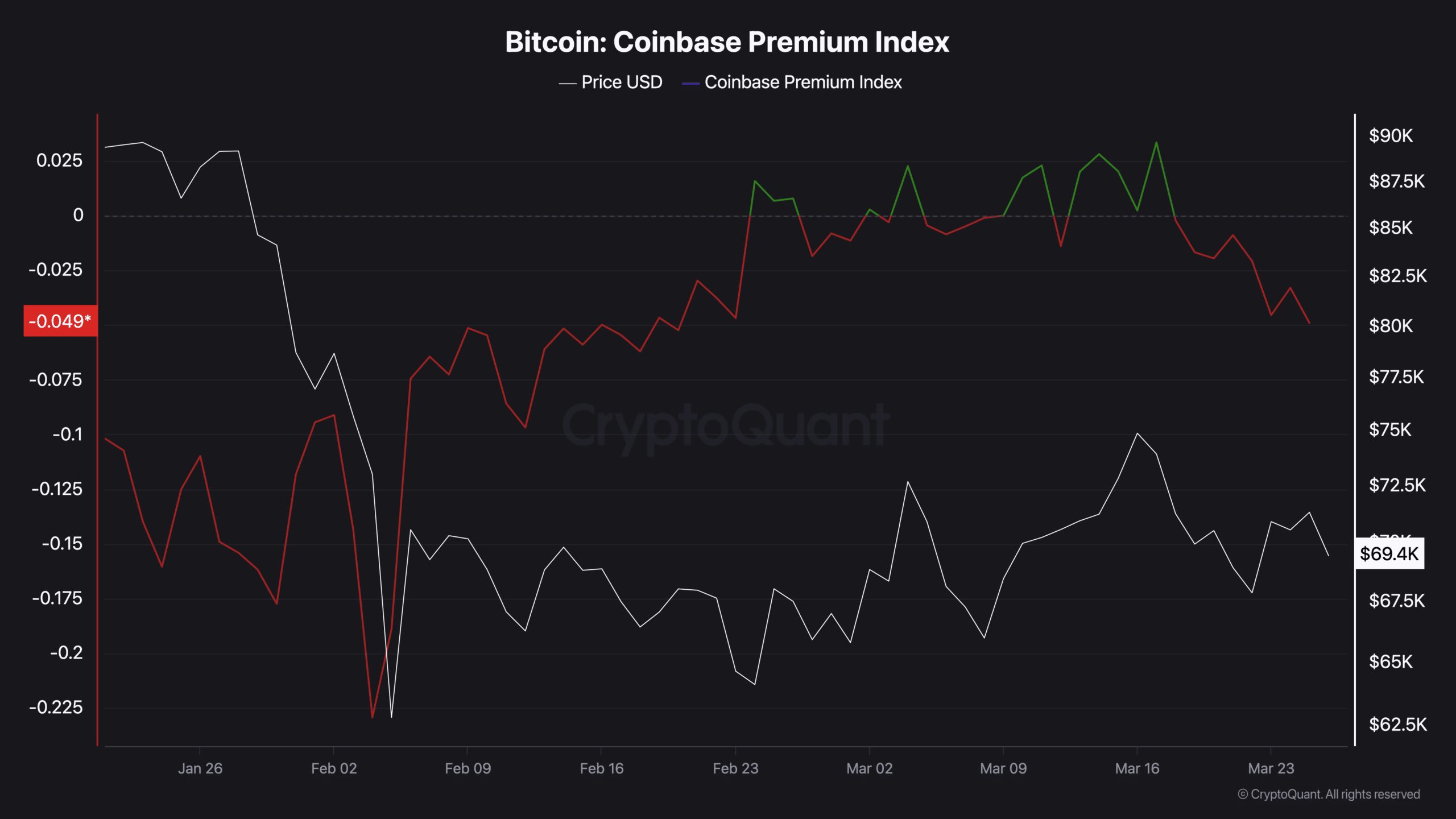 Ese sentimiento se puede medir utilizando el Índice de Prima de Coinbase. Es un indicador que compara la presión de compra en Coinbase, un exchange predominantemente estadounidense, con Binance, una plataforma dominante a nivel mundial.