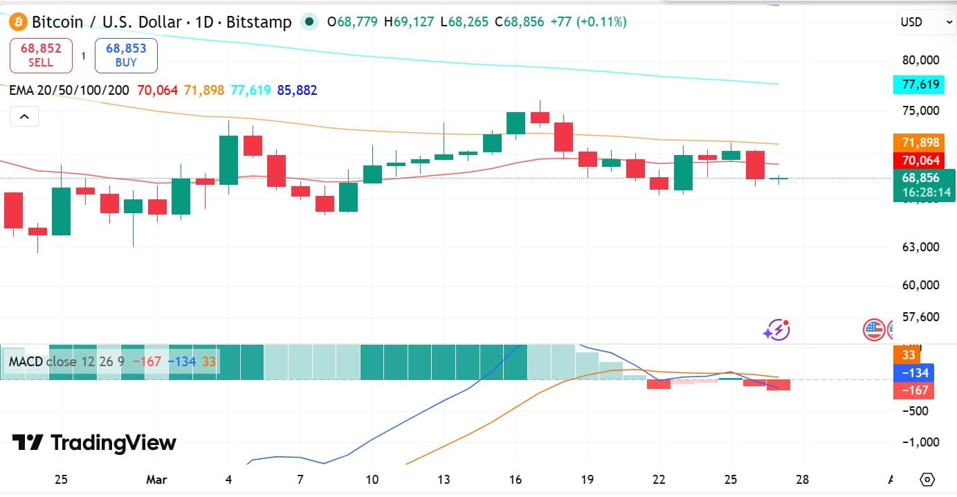 El deslizamiento del precio hizo que el BTC cayera por debajo de sus medias Móviles a corto plazo, los EMAs de 20 y 50 días, lo que indica una fuerte presión a la baja.