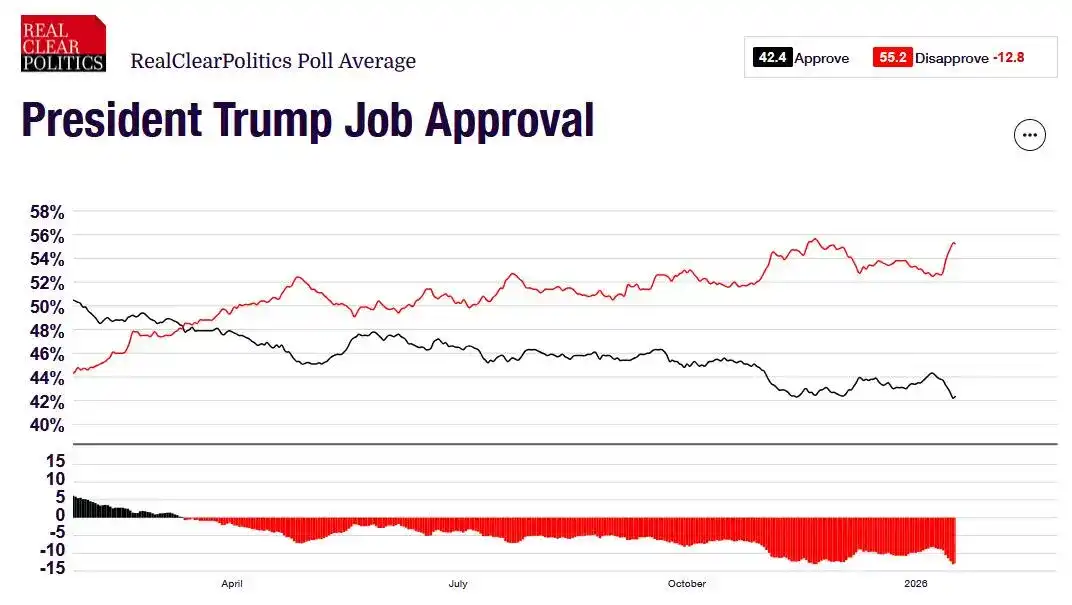 En segundo lugar, que las políticas de Trump no logren reducir el costo de vida mediante una intervención a gran escala. Los tipos de interés en la calle principal siguen siendo altos; si los precios de la energía, los seguros, la atención médica y los precios de la electricidad impulsados por la IA no bajan, será difícil mejorar el bajo índice de aprobación de Trump. Actualmente, el índice de aprobación general de Trump es del 42%, el de su política económica del 41% y el de su política inflacionaria es de solo el 36%.