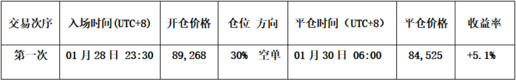 • Primera operación (ganancia del 5.1%): Esta operación ejecutó la estrategia Opción A (vender en corto tras la ruptura efectiva de la línea inferior del canal alcista): Cuando el precio se recuperó hasta la línea inferior del canal alcista mostrando debilidad en el ataque, el modelo de diferenciales emitió primero una señal de alerta de techo (punto verde), luego éste y el modelo de impulso resonaron generando una señal de techo, establecimos una posición bajista del 30% a 89.268 dólares, posteriormente la tendencia del mercado mostró un ajuste. Cuando el precio cayó hasta el nivel de soporte de 84.000 dólares, el modelo de diferenciales emitió primero una señal de alerta de fondo (punto rojo), luego el modelo de impulso cuantificado y el modelo de trading por diferenciales resonaron nuevamente generando una señal de fondo, en base a esto cerramos todas las posiciones a 84.525 dólares, logrando una ganancia exitosa.