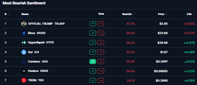 TRON [TRX] también apareció en la lista con un sentimiento cercano al 24%.