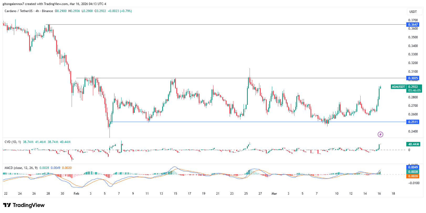 El Delta de Volumen Acumulado (CVD) fue positivo, con el indicador mostrando un volumen neto de compra de 40,44 millones de ADA. Además, el MACD estaba en verde con barras crecientes, lo que indica que los toros estaban ganando fuerza.