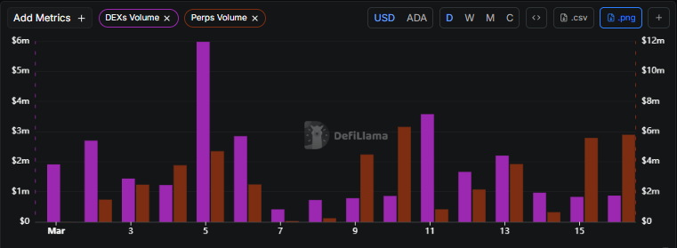 Cardano fue impulsado por el volumen de negociación en el mercado de futuros más que por el de los exchanges descentralizados (DEX). Según DefiLlama, el Volumen de Perpetuas fue de 5,79 millones de dólares, más de 5 veces el de los DEX, que fue de 871.000 dólares.